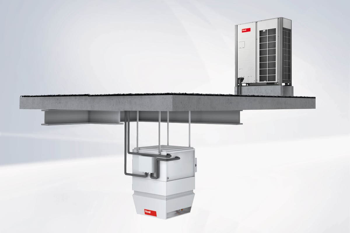 A recirkulációs berendezés reverzibilis hőszivattyúval, nagy teljesítményű hővisszanyerővel, magas csarnokok fűtéséhez és hűtéséhez alkalmas.