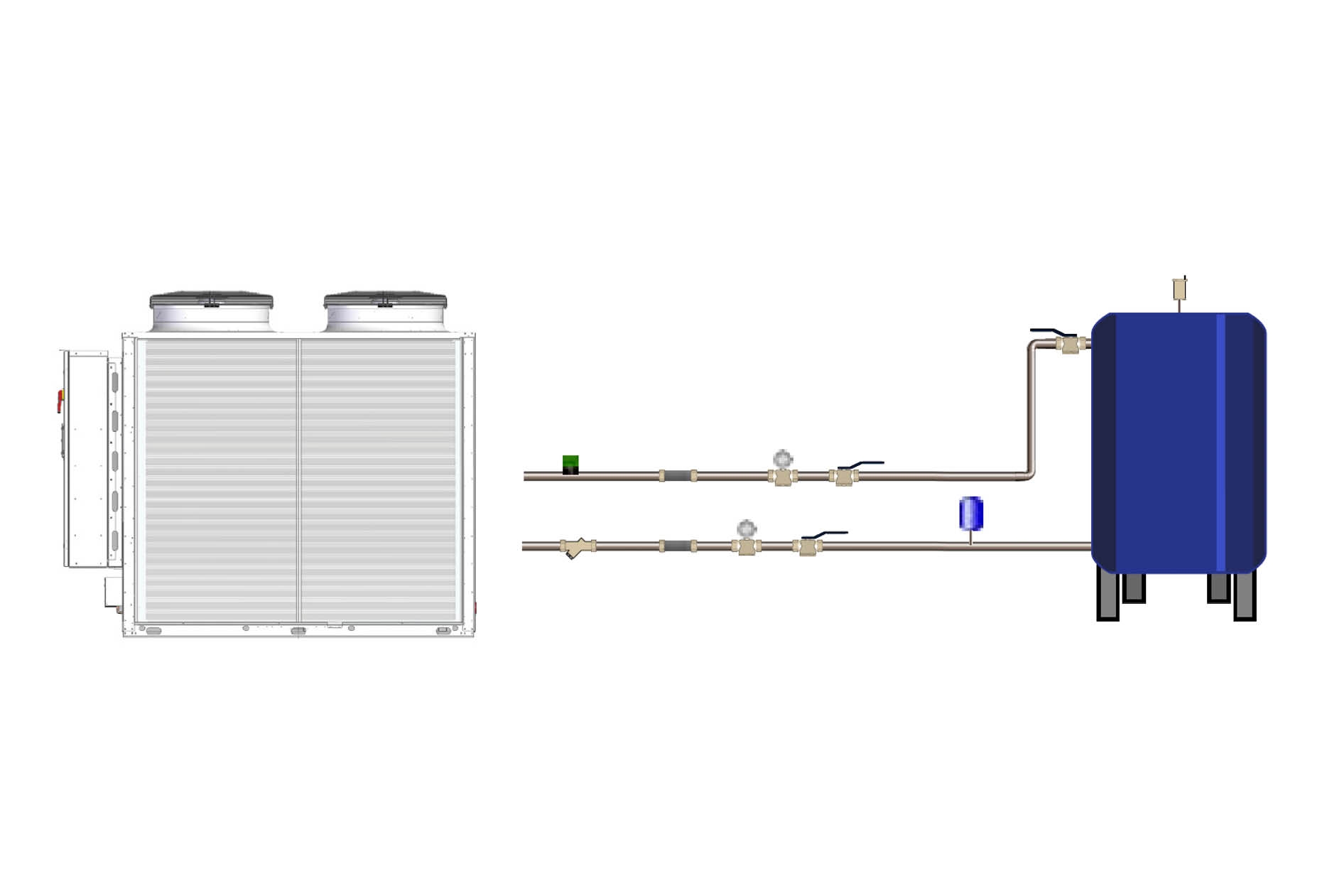 A szivattyúval ellátott rendszer hűtőközeget keringtet a folyadékhűtő és a fogyasztó(k) között. A hideg folyadék elvonja a hőt az adott helyiségből, és a meleg folyadék visszatér a folyadékhűtőbe.