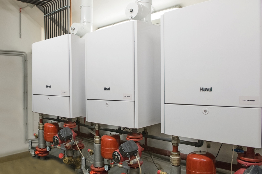 A két épületegyüttes fűtésének biztosítására 3 db Hoval TopGas® 60 és 3 db Hoval TopGas® 80 típusú kondenzációs gázkazánt telepítettünk.