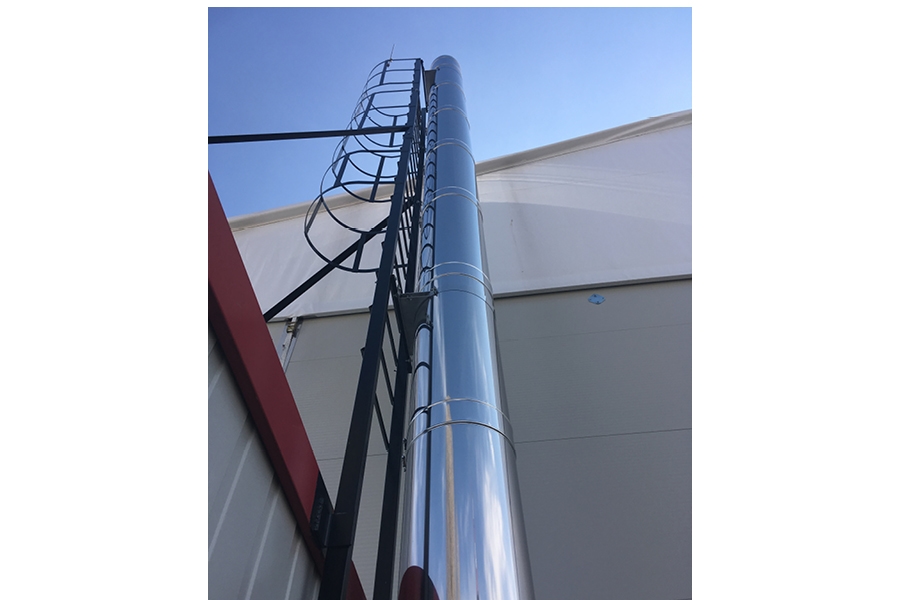 A megfelelő hőfokú víz előállítását végző kazán füstgáz-elvezetését Eka Complex D 350/400 szigetelt, szerelt kéménnyel oldottuk meg.