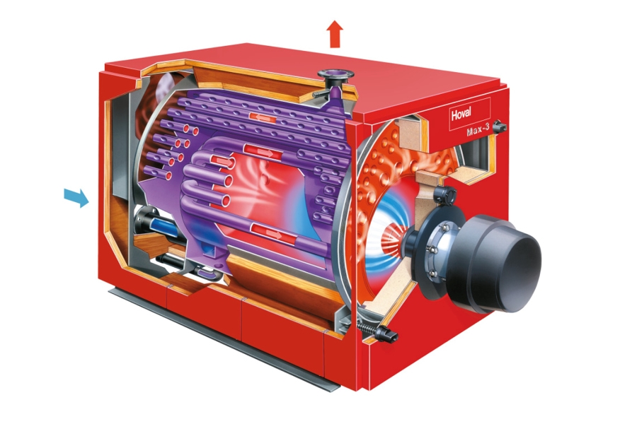 A Hoval Max-3 (420-2700) 3-huzamú, olaj- és gáztüzelésű melegvízkazán fűtésre, melegvíz- és technológiai hő előállítására, 420-3.000 kW teljesítménnyel.