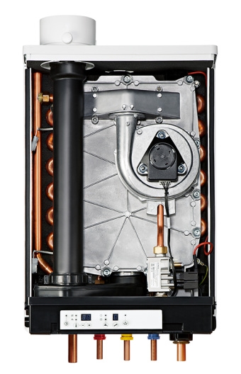 Korrózióálló alumínium-szilícium ötvözetből készült hőcserélővel és folyamatos égőszabályozású, előkeveréses felületi égővel felszerelt.