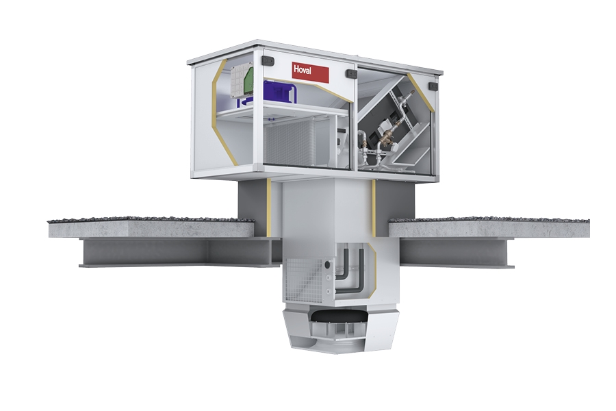 Recirkulációs tetőberendezés maximum 25 m magas csarnokok fűtéséhez és hűtéséhez, 2-vezetékes rendszerben
