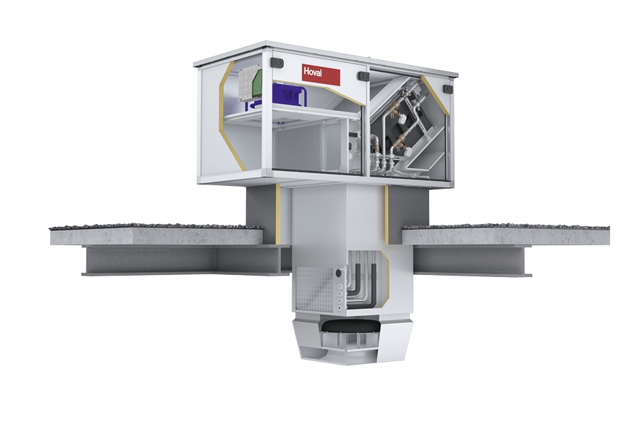 Recirkulációs tetőberendezés maximum 25 m magas csarnokok fűtéséhez és hűtéséhez, 4-vezetékes rendszerben
