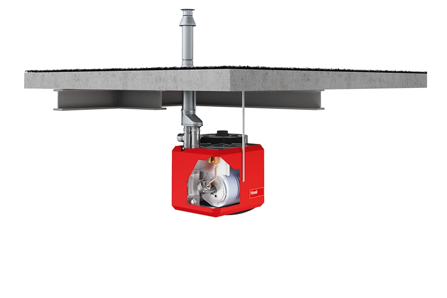 A TopVent® GV recirkulációs készülék alacsony, maximum 6 méter csarnokok költségtakarékos fűtésére alkalmas. A mennyezet alá vagy a falra szerelt készülék a helyiséglevegőt elszívja, gázfűtéses hőcserélőjében felmelegíti és a befúvózsaluzatán keresztül ismét befújja a helyiségbe.