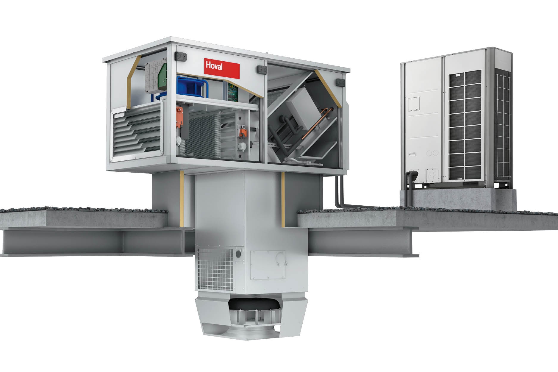 A TopVent® SP befúvottlevegős tetőkészülékek maximum 25 m magas csarnokok szellőztetését, fűtését és hűtését valósítják meg reverzibilis hőszivattyúval.