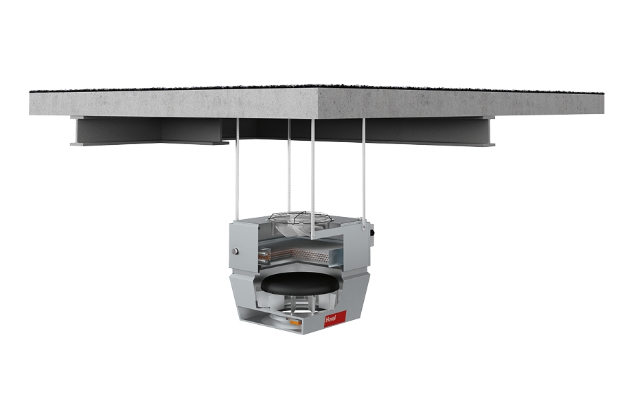 A mennyezet alá szerelt készülék beszívja a helyiség levegőjét, felmelegíti a fűtőregiszterben és az örvénykamrán (Air-Injectoron) keresztül visszafújja a helyiségbe.