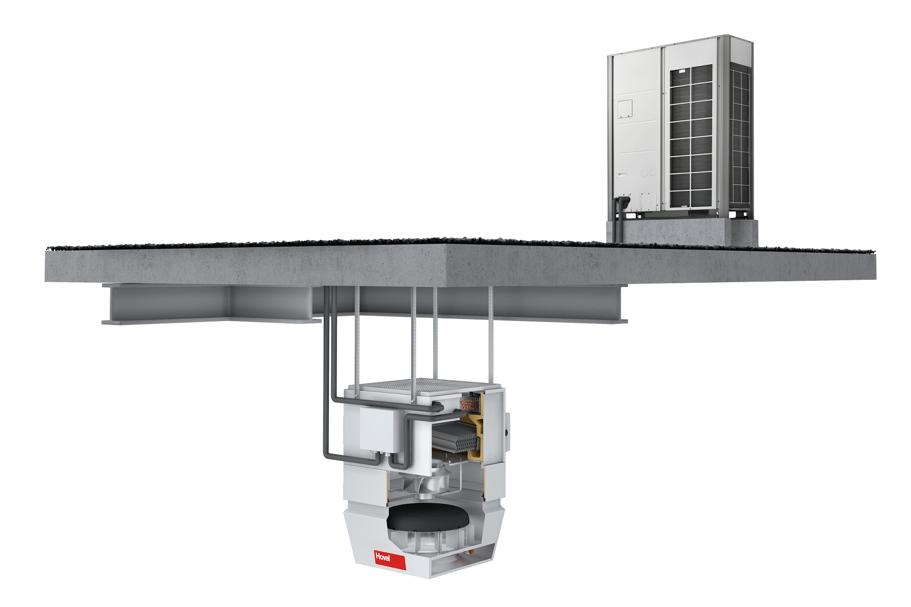A recirkulációs készülék levegő/levegő hőszivattyús rendszerrel van felszerelve, amely decentralizáltan fűt vagy hűt egyaránt.